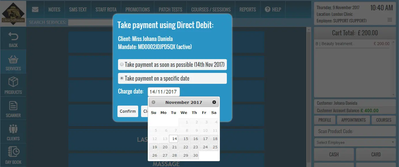 Each time you create an invoice in ClinicSoftware you can collect the payment automatically by Direct Debit on the invoice due date. Alternatively, you can collect payments on the course instalments. Collect payments in both Pounds and Euros.